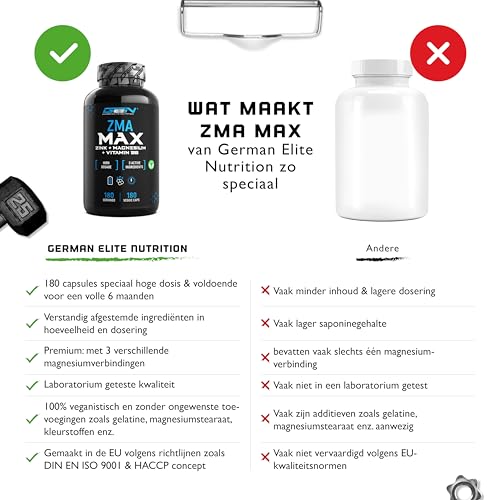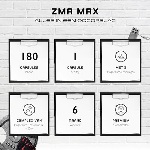 TOP PRIJS PERFORMATIE: 180 capsules in een praktische voorraad van 3 maanden. ZMA MAX is een hoogwaardig complex van de drie hooggedoseerde bestanddelen magnesium + zink + vitamine B6. Optimale dosering: Elke dagelijkse portie van 2 capsules bevat 375 mg magnesium + 20 Mg zink + 12 mg vitamine B6.