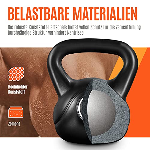 Duurzame materialen: elke kettlebell is gemaakt van kunststof en beton. De robuuste kunststof harde schaal beschermt daarbij de cementkern tegen invloeden van buitenaf en zorgt voor extra stabiliteit en grip.